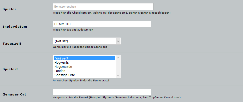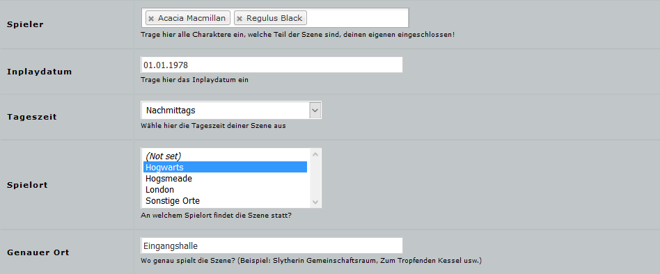 Das A und O eines Rollenspiels ist das Posten – das ist einer der Hauptgründe, weshalb wir so viel Mühe und Herzblut in die Ausarbeitung unserer Charaktere stecken: wir wollen mit ihnen im InGame durchstarten und ganz viele spannende Geschichten mit ihnen erleben. Damit ihr euch ohne Probleme im InGame zurechtfindet, wollen wir an dieser Stelle kurz und knapp erklären, wie die szenenrelevanten Felder bei der Erstellung einer neuen Szene innerhalb des InGames auszufüllen sind. Sobald ihr ein neues Thema in unserem InGame Bereich erstellt, erscheinen einige neue Felder, welche es auszufüllen gilt und welche es in den Bereichen außerhalb unseres InGames nicht gibt:![]() Das Ausfüllen der jeweiligen Felder ist ziemlich einfach und selbsterklärend. In dem Feld Spieler werden alle Charaktere angegeben – auch der eigene Charakter! Das Feld ist eine Art Suchfeld, in welchem die Charakter getagged werden. Sobald ihr die ersten paar Buchstaben des Namens des Charakters eingegeben habt, findet das System den passenden Charakter automatisch. Ihr dürft nicht vergessen, euren eigenen Charakter ebenfalls zu taggen, denn sonst wird die Szene nicht in eurem Szenentracker erscheinen. Im Feld Inplaydatum gebt ihr das Datum an, an welchem eure Szene spielt. Schreibt das Datum auf die folgende Art und Weise: TT/MM/JJJJ und auch nur auf diese Weise, denn sonst wird das Datum eurer Szene fehlerhaft angezeigt. In den Feldern Tageszeit und Spielort könnt ihr im Dropdown-Menü die zu eurer Szene passende Option auswählen, um die zeitlichen und räumlichen Umstände der Szene genauer einzugrenzen. Im Feld Genauer Ort könnt ihr dann schließlich den Ort eurer Szene genauer bestimmen, beispielsweise könnt ihr hier eintragen, in welcher Wohnung, in welchem Café, in welchem Gemeinschaftsraum oder an welchem Ort auch immer eure Szene spielt. Ein ausgefülltes Formular könnte folgendermaßen aussehen: ![]() Nachdem ihr die Szene gepostet habt, wird sie mitsamt der angegebenen Informationen folgendermaßen angezeigt: ![]() Auch in eurem Szenentracker und in der Szenenübersicht in euren Profilen wird die Szene angezeigt, sodass ihr stets eine Übersicht über all eure Szenen habt. Verschieben von Szenen