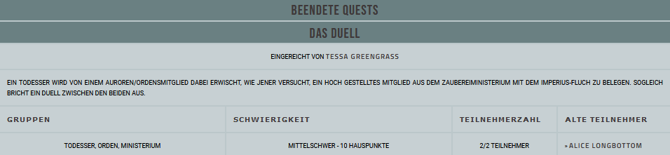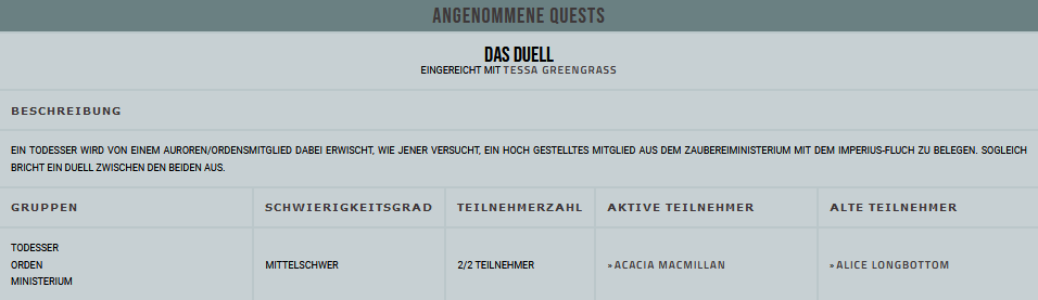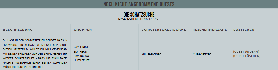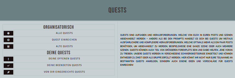 Quests, welche nicht mehr aktuell sind, da die Teilnehmer jene erfolgreich abgehandelt haben, werden in diese Übersicht verschoben. Anders als Prompts können Quests nur einmal abgehandelt werden, da die Handlungen – vor allem, wenn jene Teil eines größeren Plots sind – sich sonst wiederholen würden. Quests sollen immerhin immer wieder neue Herausforderungen darstellen. Hier könnt ihr also jegliche Quests einsehen, welche bereits beendet worden sind und welche Charaktere an jenen beteiligt gewesen sind!![]() Nun wären wir auch schon beim zweiten Menüpunkt: Deine Quests. Deine offenen Quests
