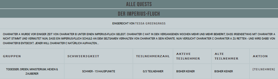 Hier findet ihr alle Quests, welche bislang eingereicht worden sind. Ihr habt einen Überblick darüber, was für Quests es gibt und seht auf einen Blick, für welche Gruppen eine bestimmte Quest gedacht ist und in welchem Schwierigkeitsgrad sie sich befindet.![]() Euch wird zudem angezeigt, wie viele Charaktere an einer Quest teilnehmen können – manche Quests können nur von einer bestimmten Anzahl an Charakteren bespielt werden, was also bedeutet, dass ihr zum Erfüllen einer Quest eine bestimmte Charakteranzahl benötigt. Manche Quests haben jedoch keine bestimmte Charakteranzahl und können in Szenen von zwei oder mehreren Charakteren ausgespielt werden. Unter dem Punkt Aktive Teilnehmer könnt ihr sehen, welche Charaktere sich für die Szene eingetragen haben und jene gerne ausspielen möchten. Wenn ihr also ebenfalls Lust darauf habt, die Quest abzuhandeln, braucht ihr einfach nur auf Teilnehmen zu klicken. Der Mitspieler bzw. die Mitspieler, welche sich bereits für die Quest eingetragen haben, bekommen dann eine automatisch generierte PN, in welcher sie darüber informiert werden, dass jemand Neues sich für die Quest eingetragen hat. Dies soll euch dabei helfen, untereinander Kontakt aufzunehmen, sobald sich genügend Charaktere für die Erfüllung der Quest eingefunden haben! Ihr könnt dann, wenn entweder die maximale Charakteranzahl erreicht ist oder sich – im Falle, dass keine bestimmte Charakteranzahl benötigt wird – mehrere Charaktere für die Quest gemeldet haben, via PN oder Discord Kontakt aufnehmen und eure Szene planen. Hier müsst ihr in Eigeninitative handeln – das System informiert euch, wenn es neue Anmeldungen für die Quest gibt, doch eure Szene planen bzw. beginnen müsst ihr selber. Dann gibt es noch folgenden Punkt in der Übersicht: Alte Teilnehmer. Da es eine Quest immer nur einmal gibt und jene nicht – wie die Prompts – unendlich oft ausgespielt werden können, werden die Teilnehmer einer Quest, sobald jene beendet worden ist, zu diesem Punkt verschoben. Quest einreichen