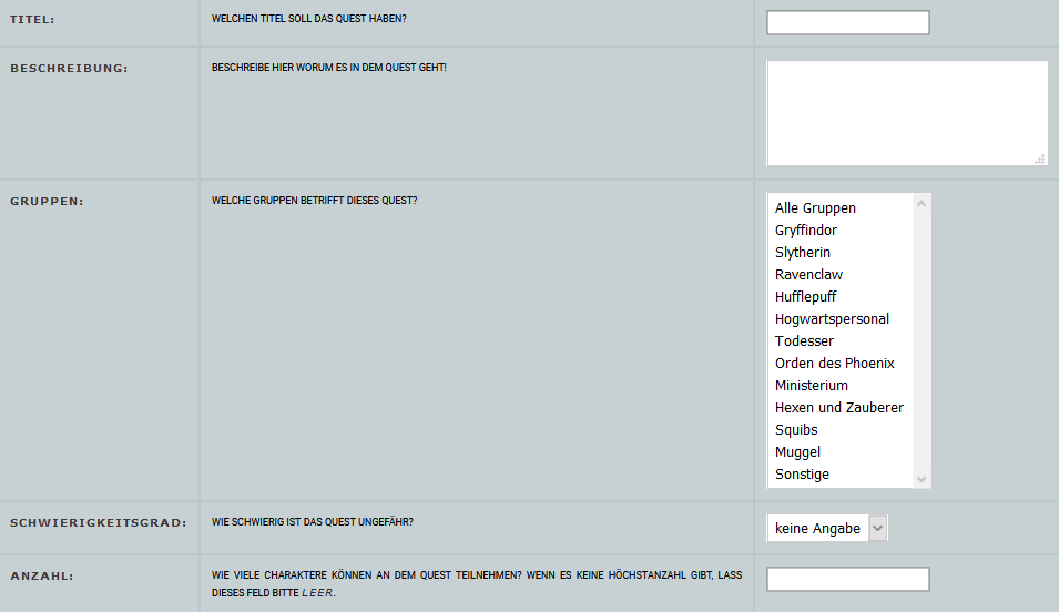 Ihr habt eigene Ideen für Quests und wollt jene gerne in unserer Quest-Sammlung verewigt sehen? Nichts leichter als das! Wenn ihr eine Quest einreichen wollt, müsst ihr einfach nur das folgende Formular ausfüllen:![]() Beschreibt den Inhalt eurer Quest bitte so genau wie möglich. Zudem müsst ihr noch angeben, für welche Gruppe oder Gruppen die Quest gedacht ist – hier sind Mehrfachantworten möglich, da viele Quests nicht nur auf eine Gruppe zutreffend sind, sondern für mehrere Gruppen passend sind. Dann müsst ihr noch auswählen, welchen Schwierigkeitsgrad eure Quest umfasst. Hier müsst ihr genau überlegen, ob es sich um eine eher einfache Quest handelt, welche innerhalb von ein paar Posts abgehandelt ist oder um eine mittelschwere Quest, welche mehrere Posts in Anspruch nimmt. Oder ob eure Quest sehr komplex ist und mindestens eine komplette Szene zur Abhandlung benötigt. Danach müsst ihr nur noch angeben, wie viele Charaktere an der Quest teilnehmen können (bitte eine Zahl angeben, nicht ausschreiben!). Wenn unbegrenzt viele Charaktere an der Quest teilnehmen können, braucht ihr das Feld einfach nur leer lassen. Sobald ihr eure Quest eingereicht habt, prüft das Team, ob alles seine Richtigkeit hat. Wenn eure Quest vom Team angenommen wird, werdet ihr darüber per PN benachrichtigt und bekommt 5 Hauspunkte zur Belohnung. Wenn eine Quest jedoch noch überarbeitet und dementsprechend erst einmal abgelehnt wird, erhaltet ihr ebenfalls eine PN, in welcher das Team euch erklärt, woran es gehapert hat und was verbessert werden muss. Ihr habt dann zwei Wochen lang Zeit, eure Quest zu überarbeiten oder zu löschen. Alte Quests